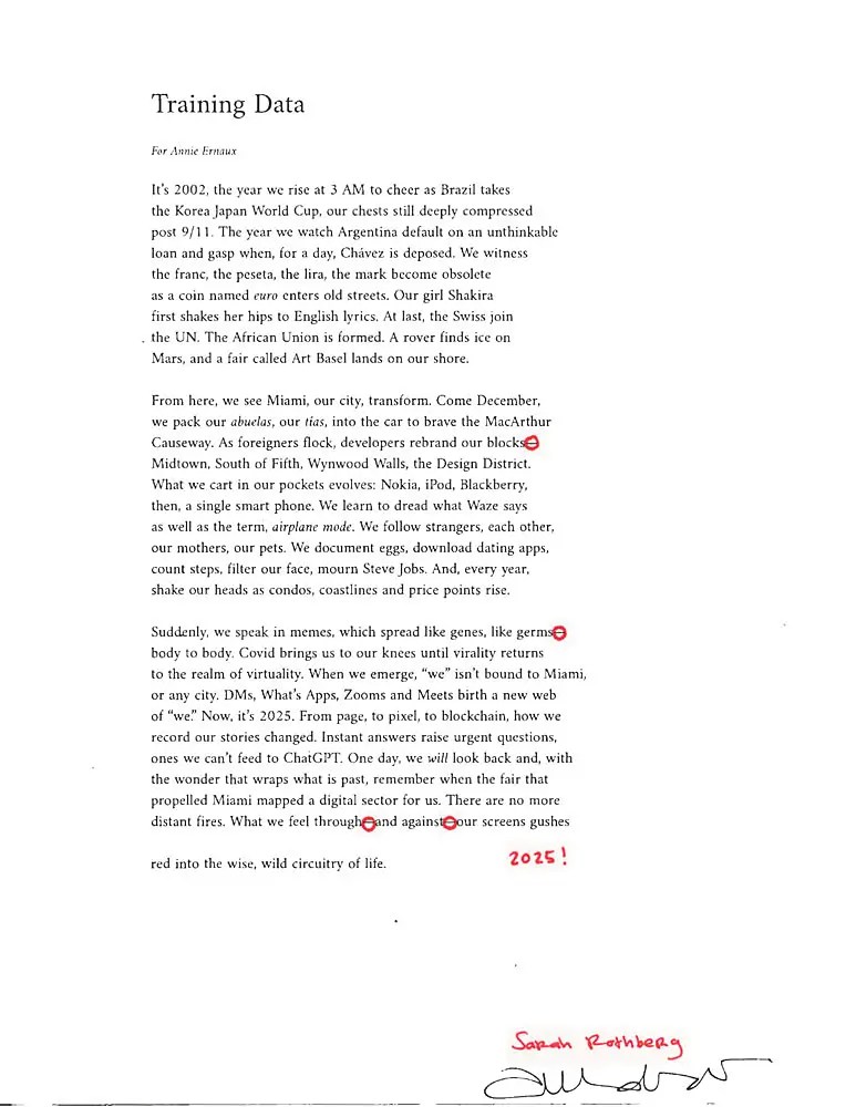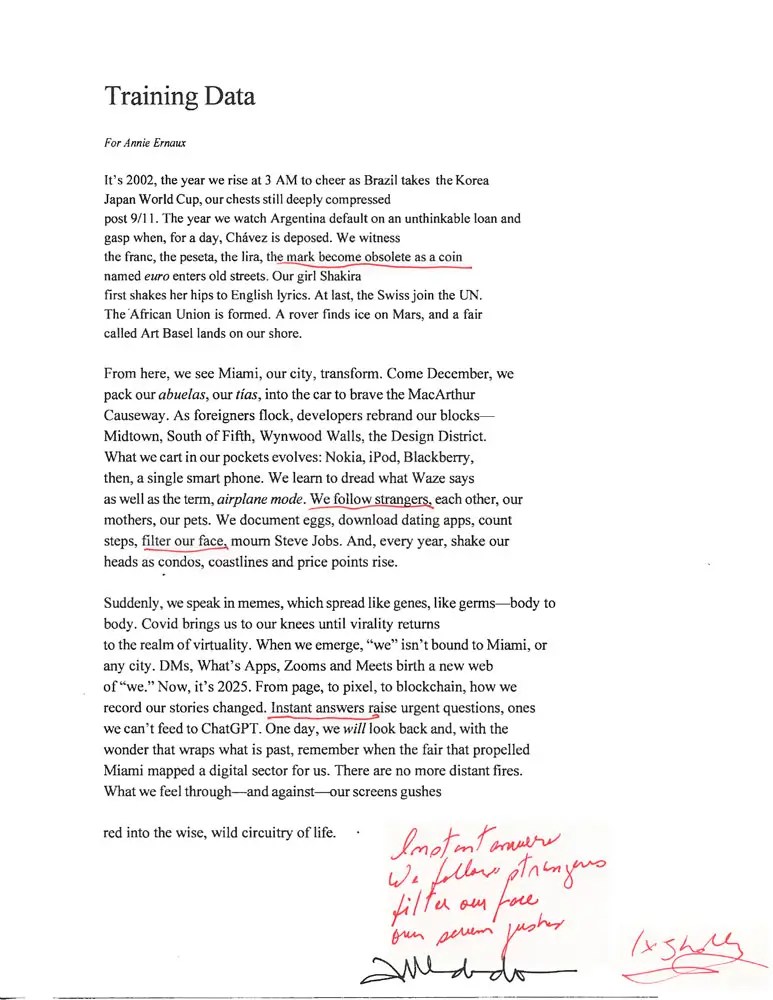 At the core of the collection is Training Data, a poem Caballero wrote to commemorate the launch of Zero 10, the fair’s new digital sector, situating a historic moment within her own story.